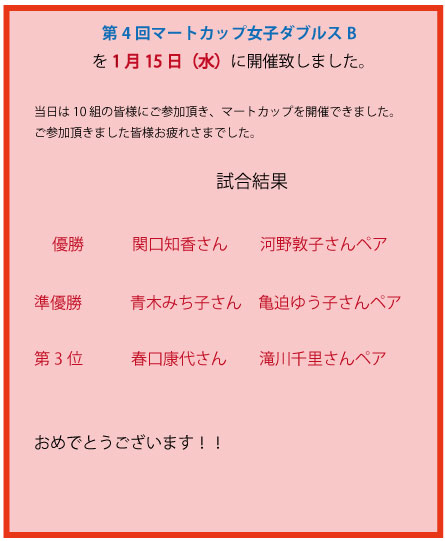 第2回女子ダブルス:2013.1.9:8組参加頂きました。ありがとうございました。