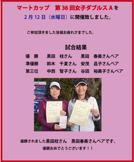 第36回女子ダブルスA:2020.2.12 8組のご参加を頂きました。ありがとうございました。 優勝ペア 黒田 桂さん 黒田春美さんペア (第36回女子ダブルスA)